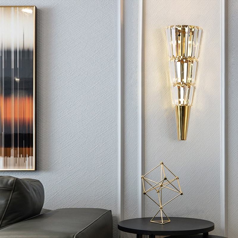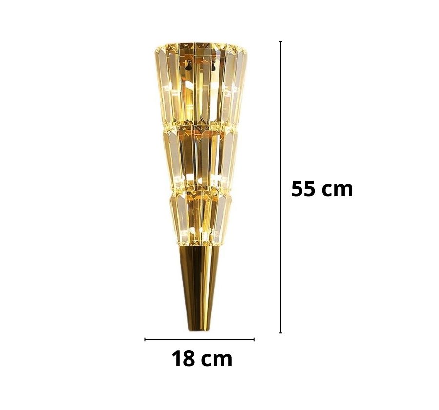 The tapered structure features three layers of high-grade prismatic crystals that cascade light beautifully, creating mesmerizing reflections on your wall.