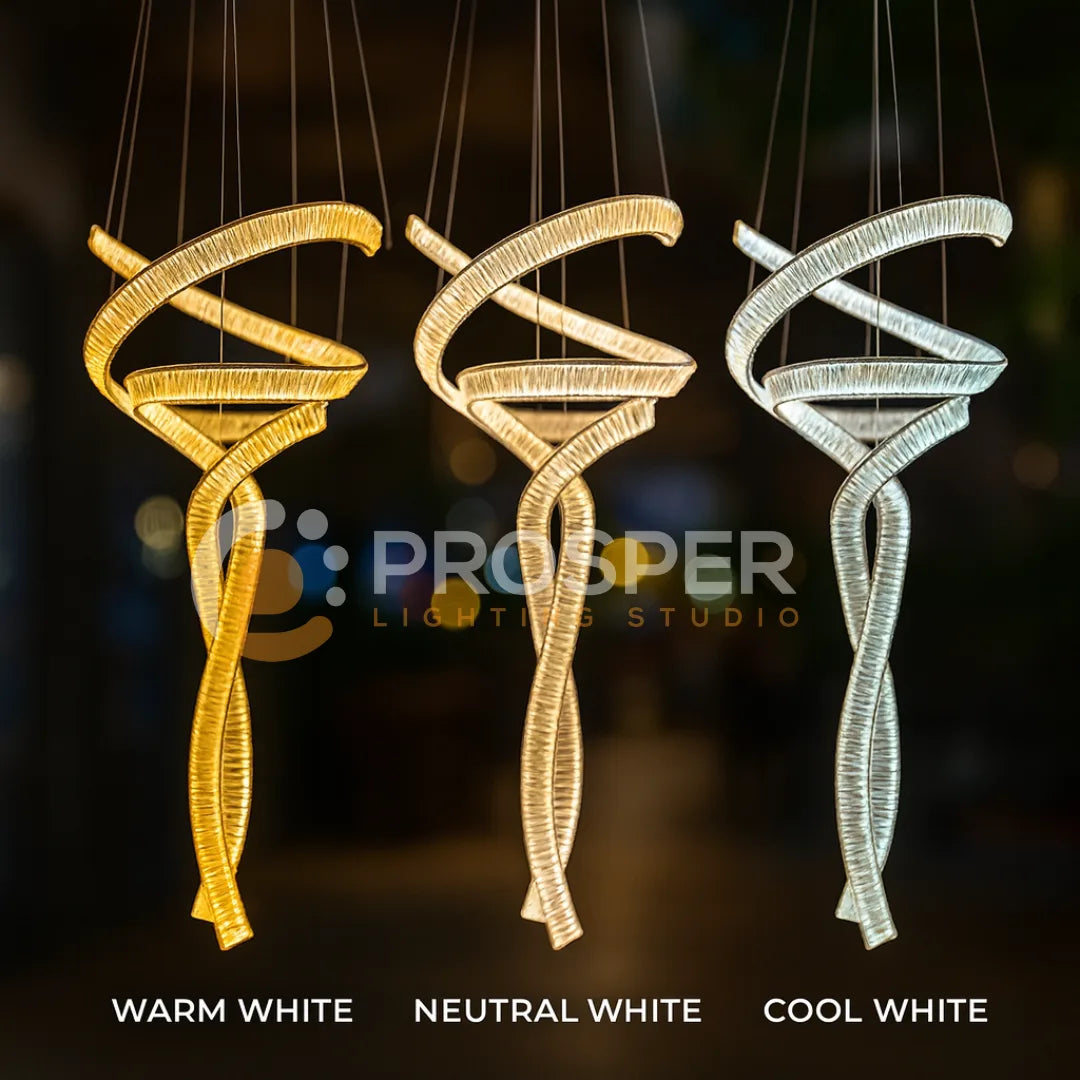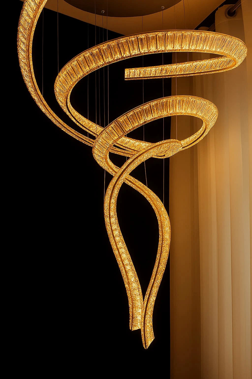 Each curve is illuminated by integrated warm LED lights, diffusing a soft golden glow that enhances every facet of your home’s architecture. Whether suspended above a grand staircase or cascading through an open atrium, Twilight Cascade becomes the centerpiece of conversation and awe.
