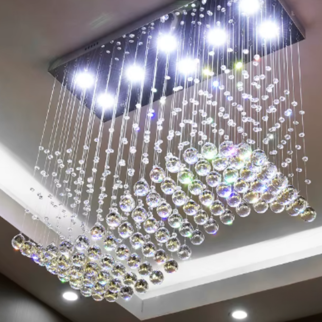 Each crystal ball catches light beautifully, producing mesmerizing rainbow reflections that elevate the entire ambiance. Paired with a powerful LED base, this chandelier delivers brilliant illumination while maintaining a sleek, contemporary presence ideal for living rooms, staircases, foyers, dining areas, showrooms and duplex spaces.